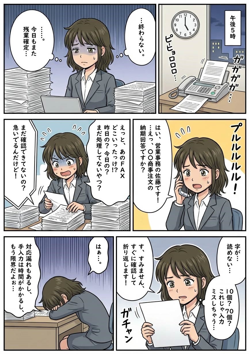 顧客への受領確認や納期回答のFAX送信が必要。誤送信のリスクに神経を使う作業。